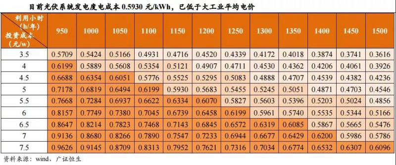 全國大工業(yè)電價的均價為0.61元/kWh。以光伏系統(tǒng)投資成本5元/W,全國平均年有效利用小時1150小時計算,目前光伏系統(tǒng)發(fā)電成本0.5930元/kWh,已經(jīng)低于大工業(yè)電價。