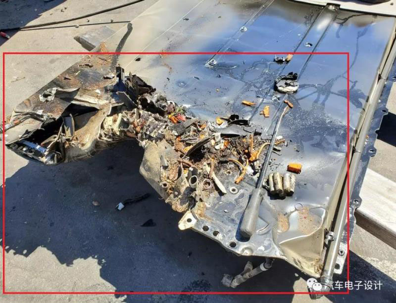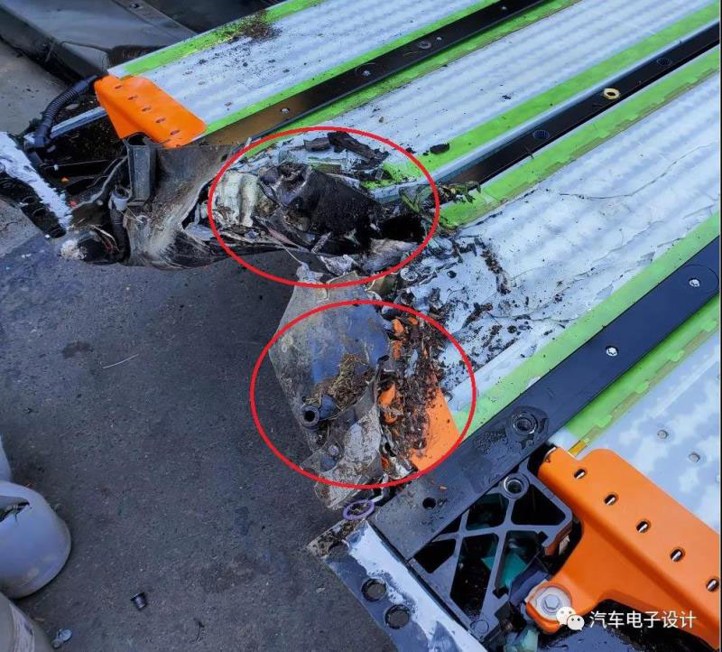 在事故中等于最惡劣的情況,底盤前面的部分沒有防護(hù)好,正面有物理直接往電池系統(tǒng)前方切開前面的保護(hù),讓前部的電芯受到了直接的力,整個電池系統(tǒng)的結(jié)構(gòu)防護(hù)給破壞,物理直接對著電芯就施加了擠壓力。