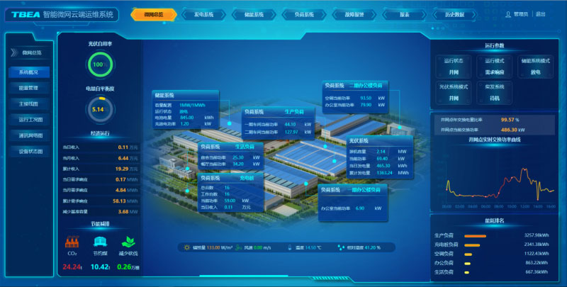 TEMSμ能量管理系統(tǒng)通過智能終端實現(xiàn)電網(wǎng)、光伏發(fā)電、負(fù)荷與儲能等環(huán)節(jié)的全景感知,全面監(jiān)測園區(qū)的發(fā)、用電情況;同時通過氣象數(shù)據(jù)與歷史數(shù)據(jù)精準(zhǔn)預(yù)測光伏發(fā)電情況和負(fù)荷用能計劃,再通過儲能系統(tǒng)精確的充放電控制,最終實現(xiàn)園區(qū)源網(wǎng)荷儲協(xié)調(diào)控制,智能優(yōu)化調(diào)度園區(qū)用能,為工業(yè)園區(qū)生產(chǎn)、辦公和生活提供高可靠、低成本供電服務(wù)。