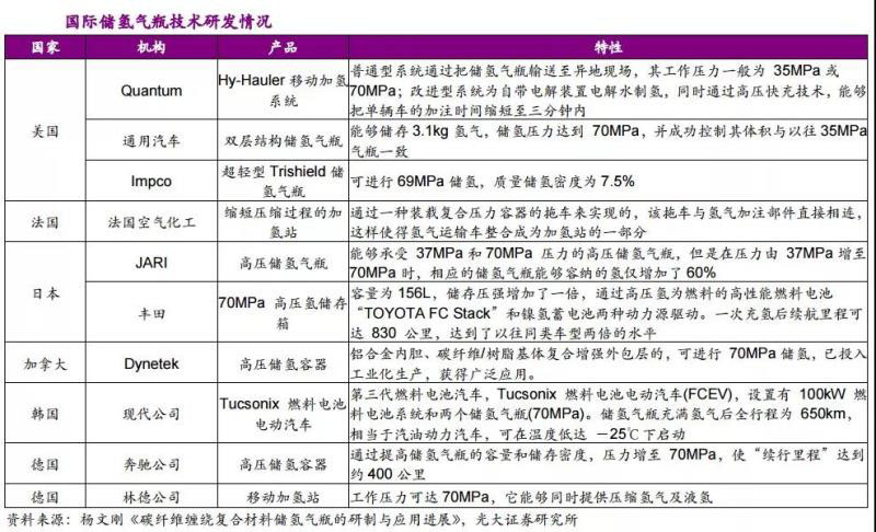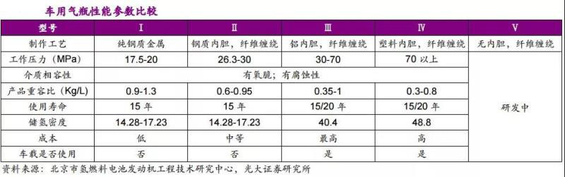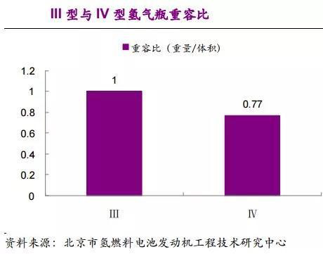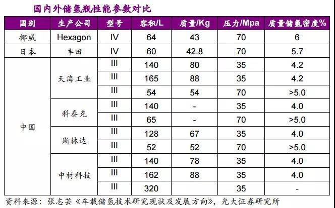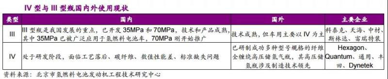國外乘用車已經(jīng)開始使用質(zhì)量更輕、成本更低、質(zhì)量儲氫密度更高的IV型瓶,而中國IV型瓶還處于研發(fā)階段,成熟產(chǎn)品只有35MPa和70MPaIII型瓶,其中70MPaIII型瓶在乘用車樣車上應(yīng)用。