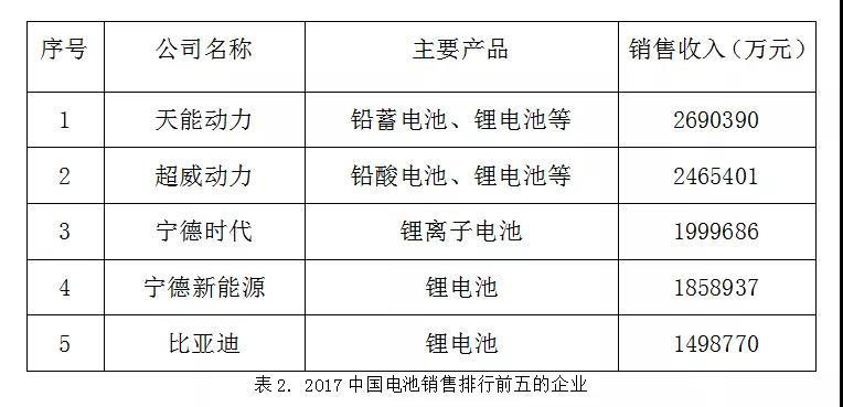 2017年,天能動力營業(yè)收入269.04億元,位列第一;超威動力收入246.54億元,位居第二;寧德時代收入199.97億元,位居第三;比亞迪收入149.88億元,位居第五。