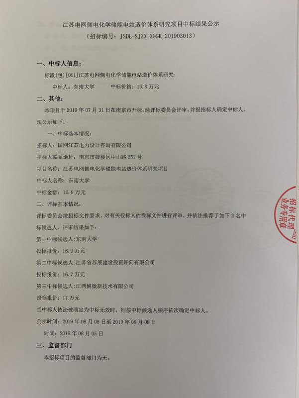 江蘇電網(wǎng)側(cè)電化學(xué)儲(chǔ)能電站造價(jià)體系研究項(xiàng)目中標(biāo)結(jié)果公示