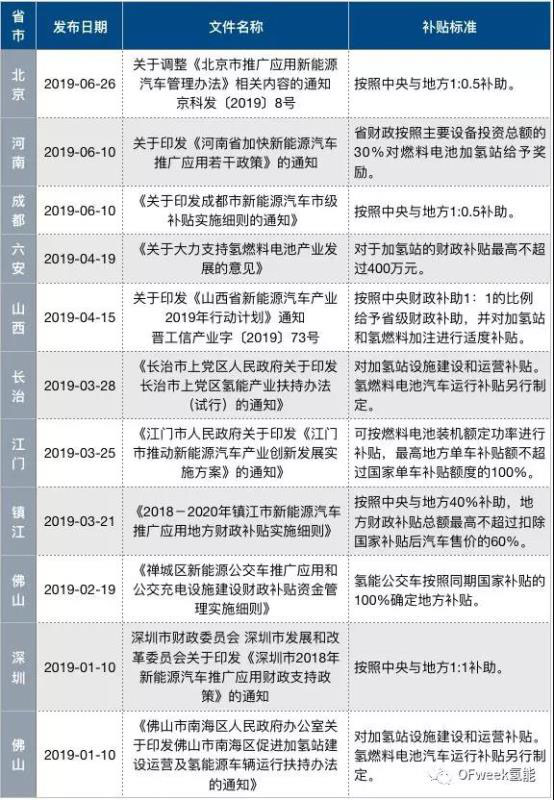 2019年3月26日,四部委發(fā)布《關(guān)于進一步完善新能源汽車推廣應(yīng)用財政補貼政策的通知》,通知從2019年3月26日起實施,2019年3月26日至2019年6月25日為過渡期。過渡期期間銷售上牌的燃料電池汽車按2018年對應(yīng)標(biāo)準(zhǔn)的0.8倍補貼。目前過渡期已過,之后的燃料電池補貼政策尚未發(fā)布。OFweek氫能匯總了2019年上半年國內(nèi)的主要燃料電池和加氫站的補貼政策。