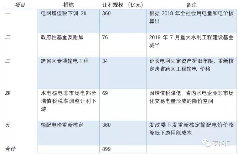 2019年一般工商業(yè)電價的下降空間,除政府性基金及附加、輸配電價重新核定外,還有來自電網(wǎng)增值稅、跨省跨區(qū)專項輸電工程、水電、核電(第三代機組)非市場電部分增值稅稅率調(diào)整等部分。粗略統(tǒng)計,電價全部下調(diào)10%后,電力企業(yè)讓利空間約達到899億元。