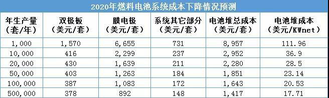 影響其成本的主要組件包括燃料電池堆中的質(zhì)子交換膜、催化劑中鉑的含量、雙極板材料,以及電池系統(tǒng)中的儲氫罐、升壓變頻器、動力單元等。