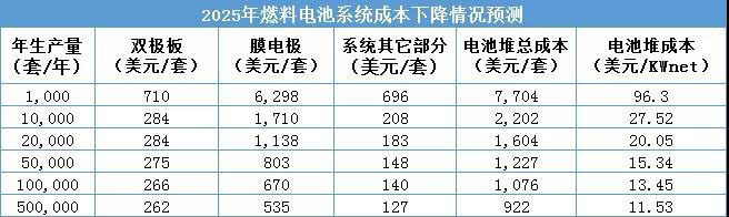 據(jù)美國能源部預(yù)測,如果產(chǎn)量能夠擴(kuò)大十倍,整車成本就將下降 23%;同時隨著電堆技術(shù)的突破,成本將再下降 23%;兩者疊加帶來的成本下降幅度將超過45%。