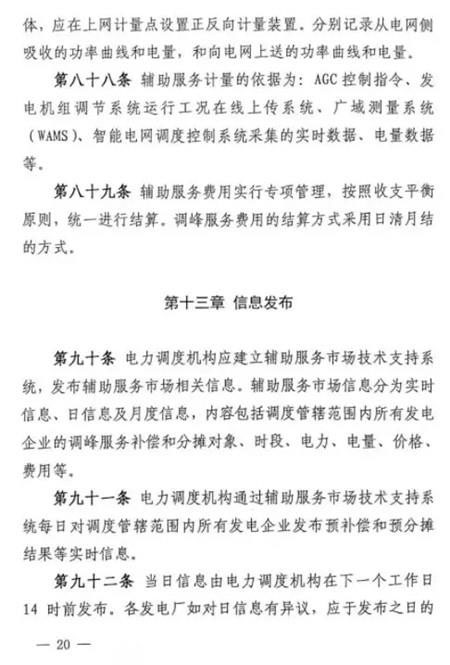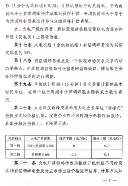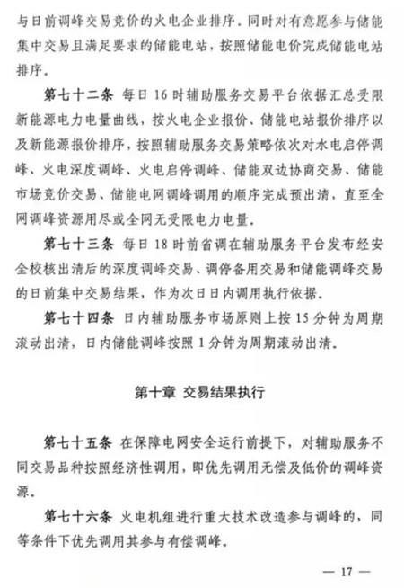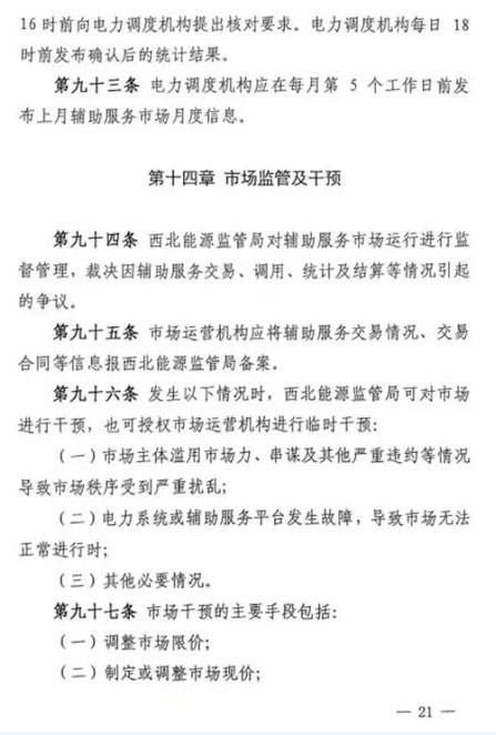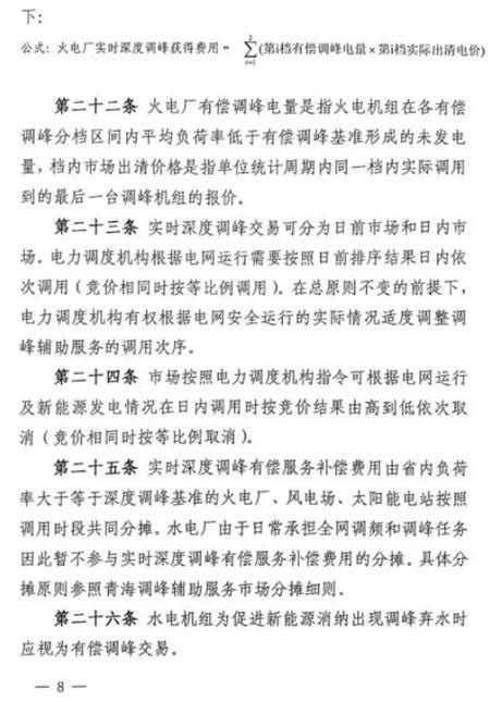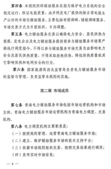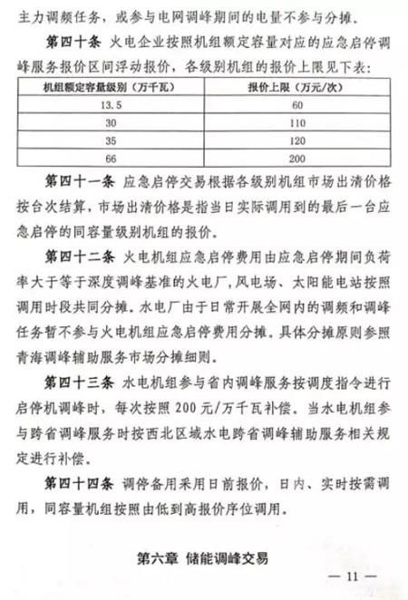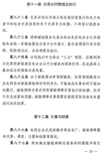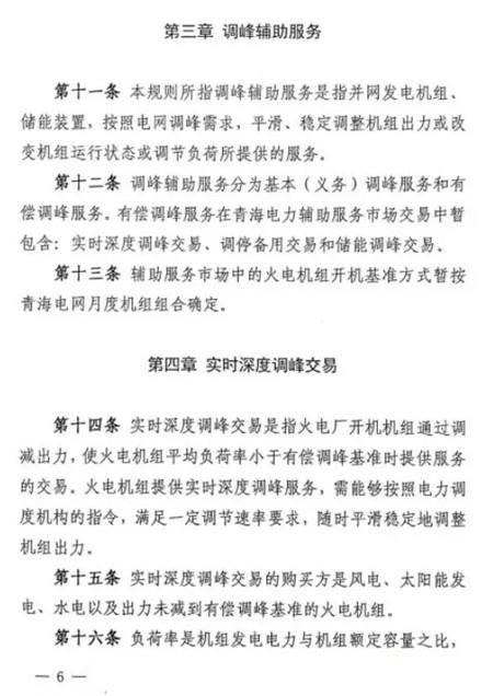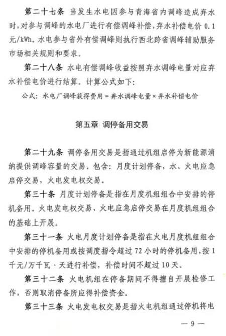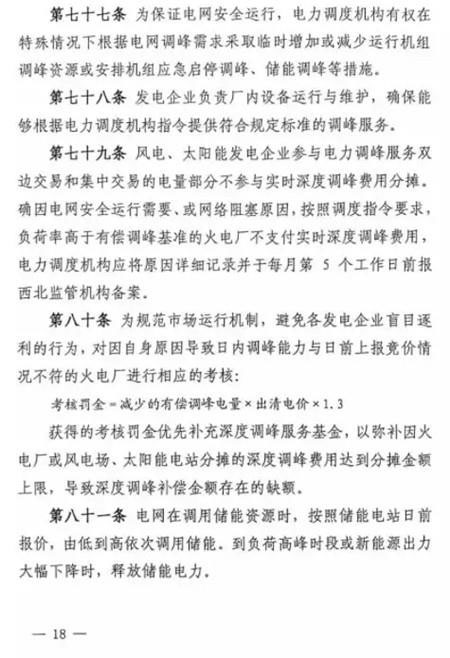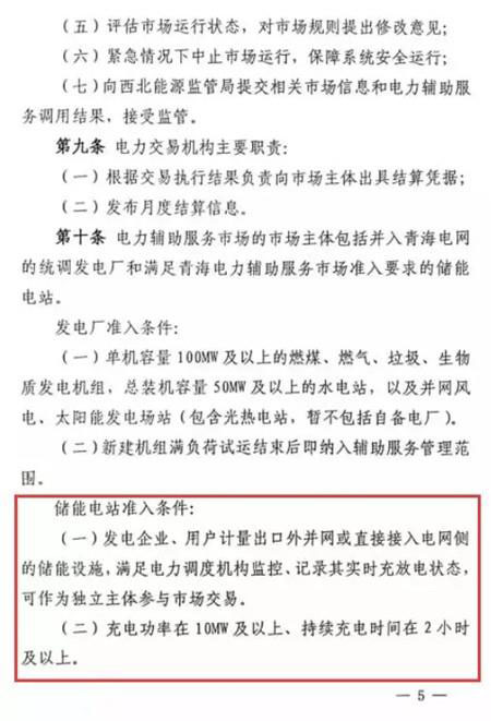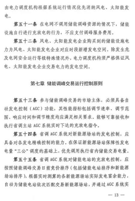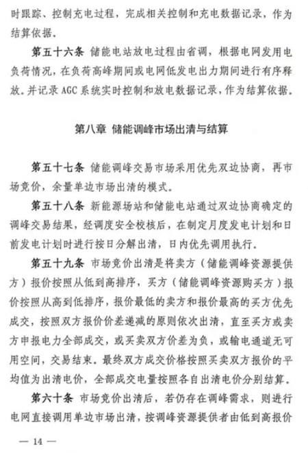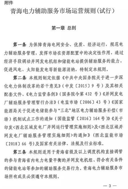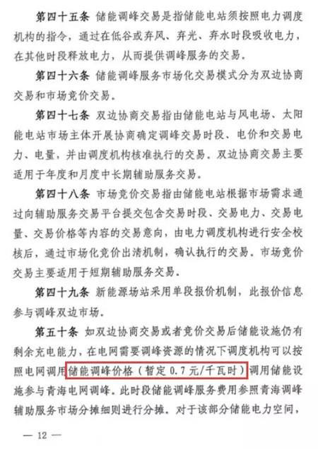 第五十條 如雙邊協(xié)商交易或者競價(jià)交易后儲(chǔ)能設(shè)施仍有剩余充電能力,在電網(wǎng)需要調(diào)峰資源的情況下調(diào)度機(jī)構(gòu)可以按照電網(wǎng)調(diào)用儲(chǔ)能調(diào)峰價(jià)格(暫定0.7元/千瓦時(shí))調(diào)用儲(chǔ)能設(shè)施參與青海電網(wǎng)調(diào)峰。此時(shí)段儲(chǔ)能調(diào)峰服務(wù)費(fèi)用參照青海調(diào)峰輔助服務(wù)市場分?jǐn)偧?xì)則進(jìn)行分?jǐn)?。?duì)于該部分儲(chǔ)能電力空間,由電力調(diào)度機(jī)構(gòu)根據(jù)系統(tǒng)運(yùn)行情況優(yōu)先消納風(fēng)電、太陽能發(fā)電。第五十一條 在電網(wǎng)不調(diào)用儲(chǔ)能調(diào)峰資源的情況下,儲(chǔ)能設(shè)施自行進(jìn)行充放電的行為,不應(yīng)支付調(diào)峰服務(wù)費(fèi)用。第五十二條 風(fēng)電、太陽能發(fā)電企業(yè)購買到的儲(chǔ)能設(shè)施電力為風(fēng)電、太陽能發(fā)電企業(yè)對(duì)應(yīng)時(shí)段新增發(fā)電空間。除發(fā)生危及電網(wǎng)安全運(yùn)行等極特殊情況外,電力調(diào)度機(jī)構(gòu)須嚴(yán)格保證風(fēng)電、太陽能發(fā)電企業(yè)交易電力的發(fā)電空間。詳細(xì)文件如下: