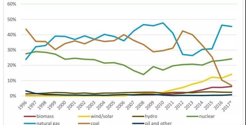 截至2016年底,英國電力系統(tǒng)的總裝機容量為98GW,其中燃氣發(fā)電占比最高,達到了46%。1996-2017年間,英國電網(wǎng)中各類電源裝機比例變化見圖1。近五年來,風(fēng)力發(fā)電與太陽能發(fā)電在英國電力結(jié)構(gòu)中的比例快速攀升,而燃煤發(fā)電比例逐年下降。