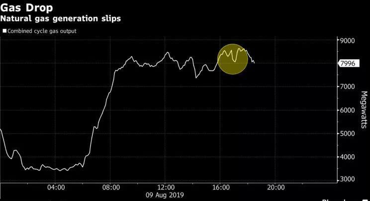 事故發(fā)生前,英格蘭與威爾士電網(wǎng)的總負荷約25351MW。位于貝德福德郡的Little Barford小巴德福燃氣電站出力730MW,占全網(wǎng)總負荷的2.88%。整個電網(wǎng)內(nèi)的風(fēng)電總出力約為8800MW,占全網(wǎng)總負荷的34.71%?;舳骱I巷L(fēng)電場出力目前還不能確定,推測約為900MW,占全網(wǎng)負荷的3.55%。