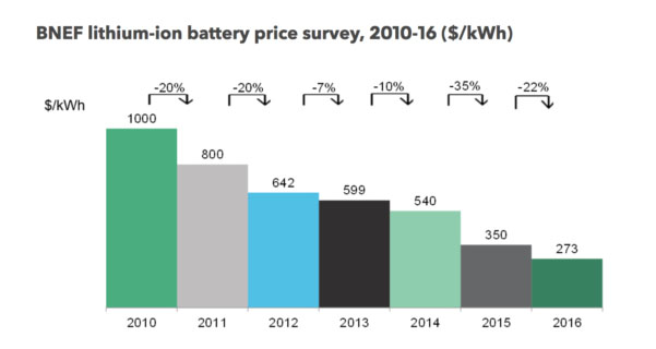 彭博新能源財經公司發(fā)布的另一份調查報告中發(fā)現(xiàn),鋰離子電池的成本也在持續(xù)下降。2010年鋰離子電池的售價高達每千瓦時1,000美元,隨后幾年價格下降超過20%。截至2016年底,鋰離子電池的平均售價每千瓦時下降209美元。