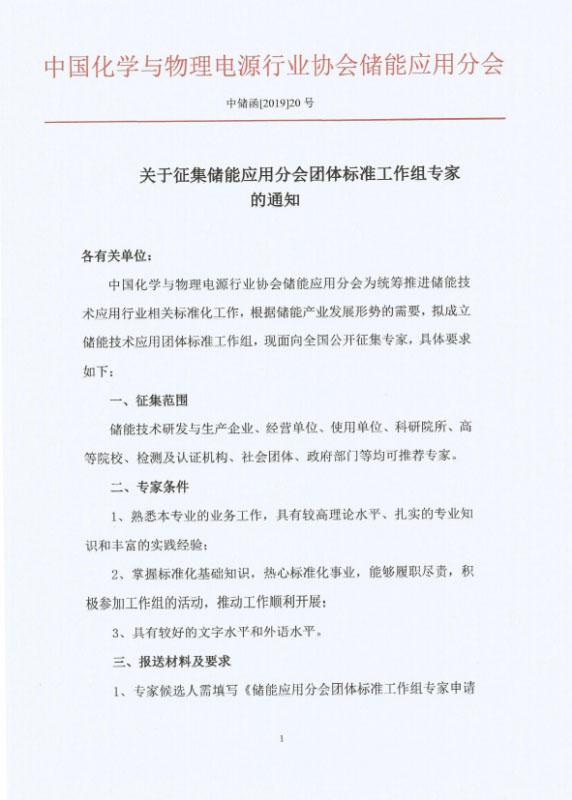 中國化學(xué)與物理電源行業(yè)協(xié)會(huì)儲(chǔ)能應(yīng)用分會(huì)為統(tǒng)籌推進(jìn)儲(chǔ)能技術(shù)應(yīng)用行業(yè)相關(guān)標(biāo)準(zhǔn)化工作,根據(jù)儲(chǔ)能產(chǎn)業(yè)發(fā)展形勢(shì)的需要,擬成立儲(chǔ)能技術(shù)應(yīng)用團(tuán)體標(biāo)準(zhǔn)工作組,現(xiàn)面向全國公開征集專家,具體要求如下: