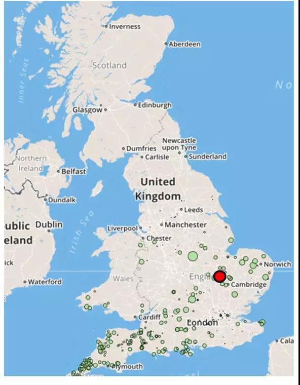 ? 圖8:英不列顛島光伏電站主要安裝區(qū)域(綠點)及小巴福電站位置(紅點)