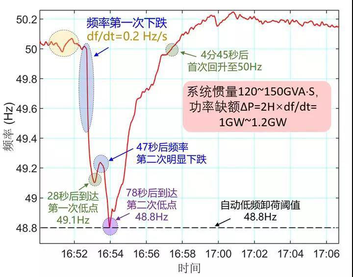 重點一:先前媒體報道的情況是660MW的小巴福電站的跳閘,導致了頻率的急速下跌,而47秒后霍恩熙風電場再次跳閘,導致了頻率的第二次下跌。在660MW發(fā)電饋入損失的情況下,電網的頻率為何會發(fā)生0.2Hz/s的快速跌落?