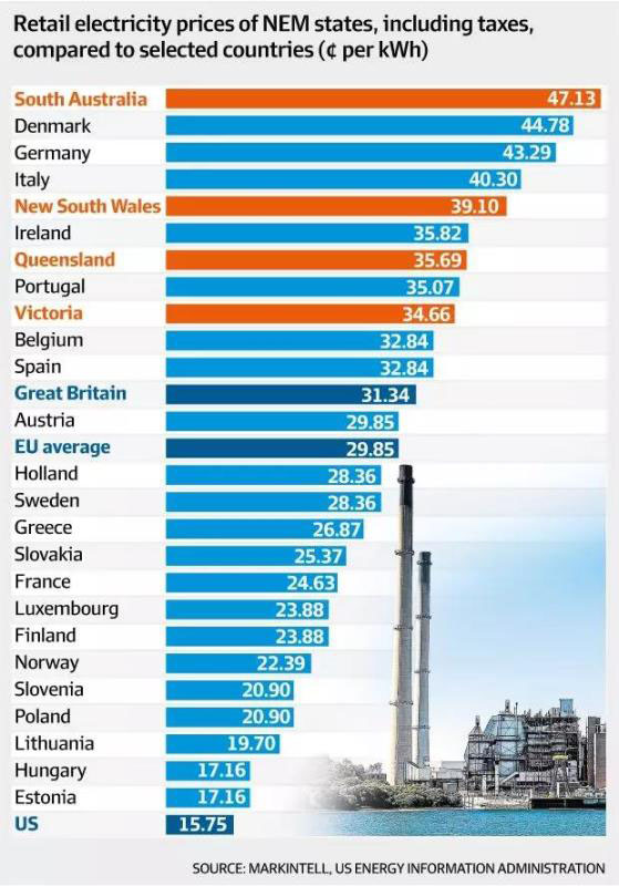 表中的價(jià)格單位是澳分/千瓦時(shí),南澳的居民電價(jià)47.13澳分/千瓦時(shí),是美國居民電價(jià)的3倍;是歐盟平均電價(jià)的1.6倍。
