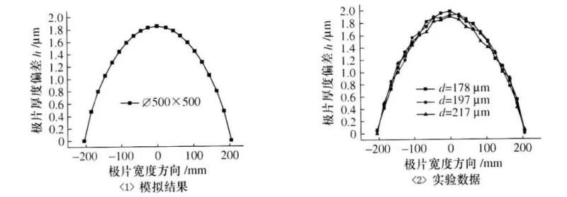 沿極片寬度方向,實驗數(shù)據(jù)和模擬數(shù)據(jù)變化趨勢大體一致,沿極片寬度方向,邊部位置厚度偏差值較小,而在中部位置偏差值達到最大。如圖4。