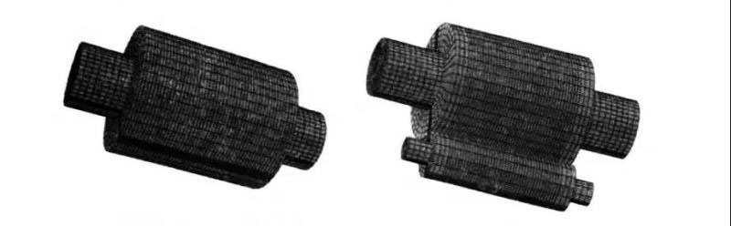 劃分網(wǎng)格方式選擇掃掠的方式,二輥輥壓機軋輥采用六面體單元C3D20R,四輥輥壓機軋輥采用六面體單元C3D8I,如圖3。