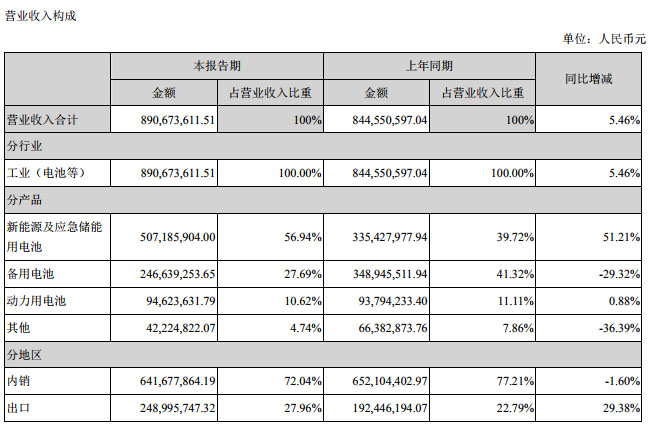 報告表示本期新能源及應急儲能用電池營業(yè)收入同比增加51.21%,主要是由于海外應急儲能業(yè)務銷售量增加所致。