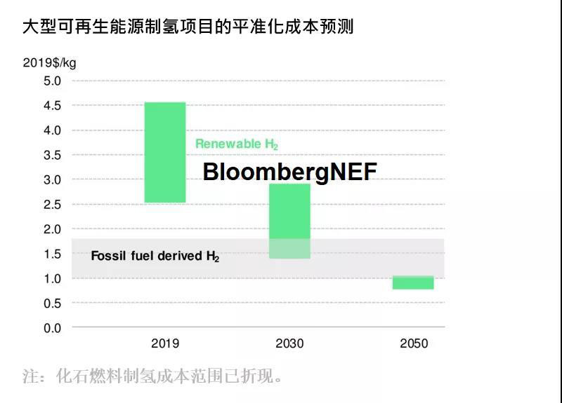 發(fā)展氫能經(jīng)濟(jì)離不開低成本、排放量小的大規(guī)模制氫方法。隨著可再生能源電力和電解槽的成本迅速下降,氫能經(jīng)濟(jì)距成為現(xiàn)實(shí)更進(jìn)一步。BNEF預(yù)計(jì),利用可再生能源大規(guī)模制氫的成本將從2019年的2.5-6.8美元/千克,降到2030年的1.4 - 2.9美元/ 千克;到2050年,成本進(jìn)一步降至0.8 - 1.0美元/ 千克,甚至低于目前化石燃料制取氫(不含碳捕獲)1 - 1.8美元/ 千克的成本。氫氣的未來發(fā)展大有可期!