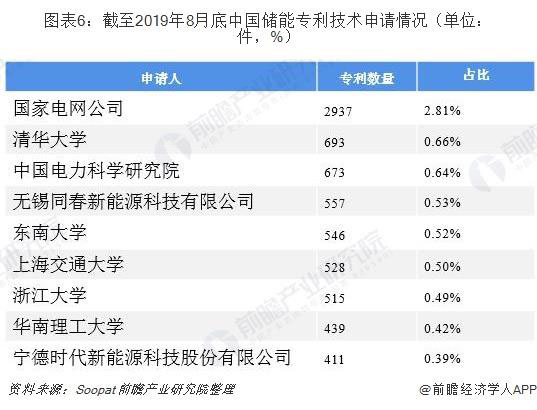 從儲能技術(shù)申請人的角度來看,截至2019年8月底,國家電網(wǎng)專利申請量最多,達2937件,占比達2.81%;此后是清華大學和中國電力科學研究院,申請量分別達693、673件,分別占比達0.66%、0.64%。