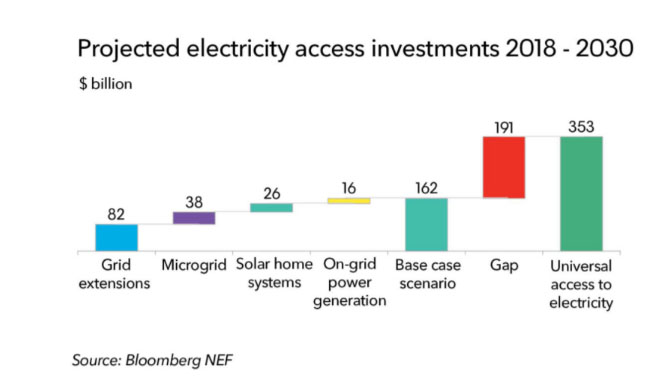 然而,到2020年中期,分布式技術(shù)將建立供應(yīng)鏈和更便宜的組件。此外,在那時(shí),電網(wǎng)擴(kuò)展和微電網(wǎng)之間的競(jìng)爭(zhēng)在經(jīng)濟(jì)上可行的區(qū)域?qū)⒏?。基于這些假設(shè),彭博社團(tuán)隊(duì)認(rèn)為,到2030年,有2.38億戶家庭獲得電力供應(yīng),7200萬(wàn)家庭將使用太陽(yáng)能家庭系統(tǒng),3400萬(wàn)家庭將從微電網(wǎng)獲取能源。