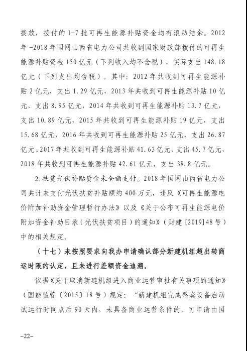 日前,山西省能源監(jiān)管辦發(fā)布《2018-2019年度山西電力調(diào)度交易秩序監(jiān)管報告》,報告指出,超額申報國家新能源補貼,賬面補貼額長期結(jié)余,扶貧光伏補貼資金支付不到位。2012-2018共收到可再生能源補貼資金150億元(不含稅),實際支出148.18億元(含稅);未支付光伏扶貧補貼金額約400萬元。
