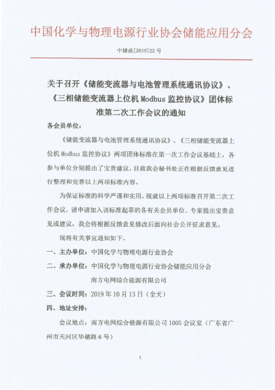 關(guān)于召開《儲能變流器與電池管理系統(tǒng)通訊協(xié)議》、《三相儲能變流器上位機Modbus監(jiān)控協(xié)議》團體標準第二次工作會議的通知