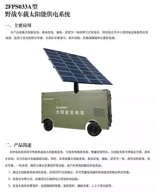 2.最普遍的方式-光伏發(fā)電設(shè)備。 清潔能源中,光伏發(fā)電是大規(guī)模使用的一種。因設(shè)備簡單可靠,對環(huán)境要求低(有太陽就行),光伏發(fā)電被各國軍隊(duì)采用。我軍也有類似設(shè)備,如這款粘有6塊黑色單晶電池片的迷彩帆布,折疊后長寬18厘米,厚度不超過3厘米,天晴時將其掛在單兵背囊上就可為裝備供電,額定功率達(dá)到20W,可以滿足電臺、“北斗一號”手持型用戶機(jī)等裝備的用電需求。