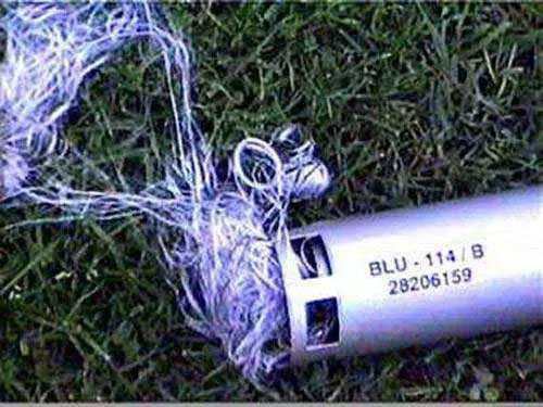 正是因?yàn)檐娛滦袆?、武器裝備對電力高度依賴,摧毀敵方供電設(shè)施也成為削弱對方戰(zhàn)斗力的主要手段之一。石墨炸彈又稱“電力殺手”,海灣戰(zhàn)爭首次登場便摧毀了伊拉克85%的供電系統(tǒng);1999年,北約空襲南聯(lián)盟,使用F-117A隱形戰(zhàn)斗機(jī)投擲BLU-114/B石墨炸彈,僅一天就讓南聯(lián)盟全國70%地區(qū)停電。石墨炸彈原理并不復(fù)雜,但對精度要求較高,破壞性極大。炸彈內(nèi)部裝有100-200個易拉罐大小的容器,容器釋放后打開頂部的小降落傘,減速下降并保持垂直。