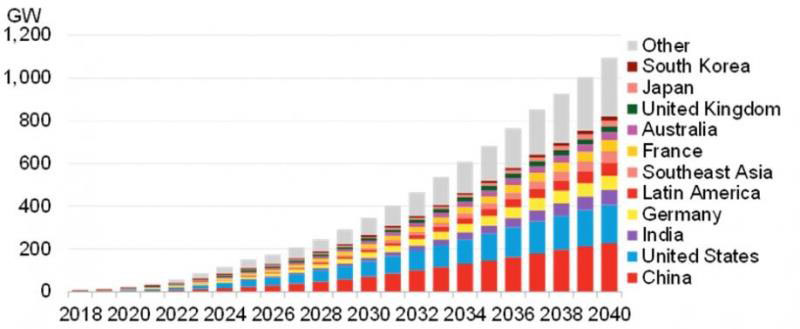 根據(jù)該公司的預(yù)測,10個(gè)國家和地區(qū)部署的儲能容量占到全球儲能市場的四分之三。韓國在2019年仍然領(lǐng)先于儲能市場,但很快就會(huì)被替代,而中國和美國將在2040年遙遙領(lǐng)先。其余重要市場包括印度、德國、拉丁美洲、東南亞、法國、澳大利亞、英國。