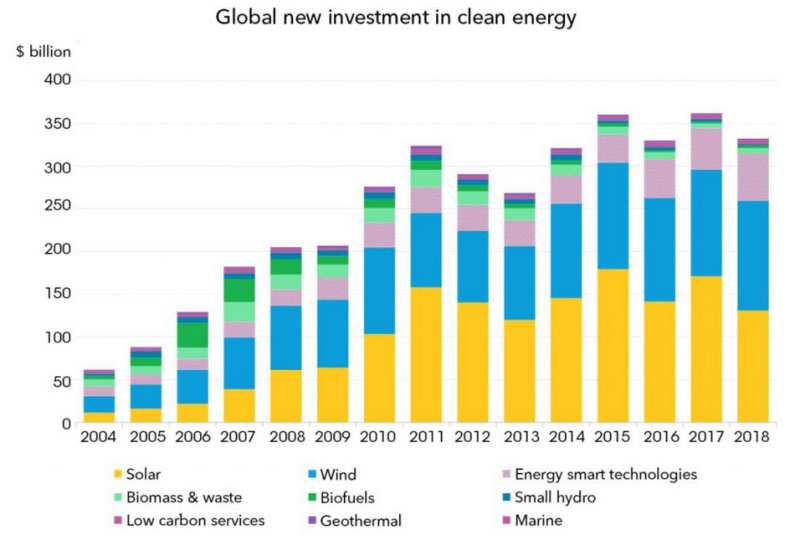 彭博社新能源財經(jīng)公司對2004年至2018年全球清潔能源行業(yè)總投資的評估提供另一個視角。