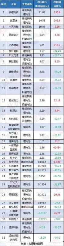 從營業(yè)收入來看,32家企業(yè)中過半企業(yè)業(yè)績飄紅、18家營業(yè)收入呈現(xiàn)增長。其中有直接參與儲能系統(tǒng)業(yè)務(wù)的21家企業(yè)中,有12家營業(yè)收入同比都有增長。按營業(yè)收入排名來看,第一梯隊有比亞迪、寧德時代、天能動力、中天科技、超威動力、欣旺達(dá)6家企業(yè)營業(yè)收入超過百億元。而且這6家企業(yè)中有5家都是以電池業(yè)務(wù)為主。超威動力和智慧能源(遠(yuǎn)東福斯特)在營業(yè)收入排名靠前,但與去年同期相比出現(xiàn)了下滑。此外鵬輝能源雖營收不多排名靠后,但與上年同期相比上漲超50%。