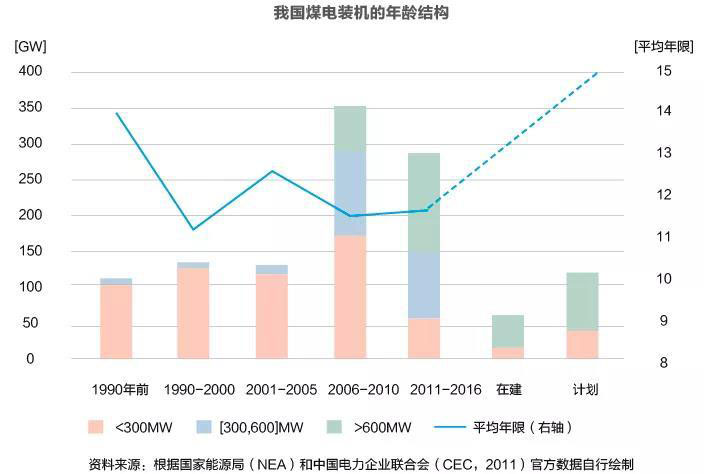 從電源裝機(jī)結(jié)構(gòu)看,煤電占據(jù)總裝機(jī)的50%以上,年新增裝機(jī)維持在30GW,并且還有相當(dāng)數(shù)量的裝機(jī)處于建設(shè)與規(guī)劃中;煤電發(fā)電量占據(jù)總發(fā)電量的60%以上,盡管其平均年小時(shí)數(shù)只有4000小時(shí)左右;煤電的容量加權(quán)平均年齡約14歲,相比較30-60年的技術(shù)壽命,可以說(shuō)還在青壯年時(shí)期。
