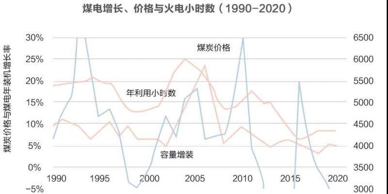 從歷史上來(lái)看,1990年以后,我國(guó)煤電裝機(jī)的增裝速度保持在每年5%-10%之間,除了2003年電荒的那幾年,節(jié)奏十分穩(wěn)定。如果審視其波動(dòng),年利用小時(shí)與煤炭?jī)r(jià)格的關(guān)系似乎更加密切,而不是政策因素。這一假說(shuō)無(wú)疑需要更仔細(xì)的計(jì)量方面的檢驗(yàn),這將是今后一段時(shí)期的工作。