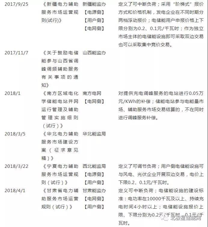 在各省提出的電力輔助服務中,開展電儲能調(diào)峰交易、開展可中斷負荷調(diào)峰交易等詞被多次提及,16年《關于促進電儲能參與“三北”地區(qū)電力輔助服務補償(市場)機制試點工作的通知》首次認可了電儲能參與電力輔助服務市場的主體資格。17年《新疆電力輔助服務市場運營規(guī)則(試行)》、《東北電力輔助服務市場運營規(guī)則補充規(guī)定》等文件在確立電儲能參與電力輔助服務市場主體的基礎上,賦予電儲能極大的靈活性。在市場地位上,電儲能即可以聯(lián)合火電作為交易主體,也可單獨作為交易主體;在交易方式上,主要是雙邊協(xié)商和集中競價兩種[16]?!渡轿魇‰娏o助服務市場化建設試點方案》和《關于鼓勵電儲能參與山西省調(diào)峰調(diào)頻輔助服務有關事項的通知》等文件還提出自動發(fā)電控制輔助服務[17],根據(jù)調(diào)節(jié)速率、調(diào)節(jié)精度和響應時間等指標制定了資金補償規(guī)則,為儲能參與調(diào)頻服務交易打破了政策障礙。