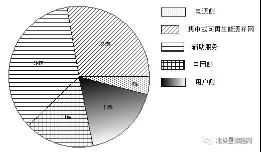 目前,儲能在我國電力市場有5個應用領(lǐng)域:電源側(cè)、集中式可再生能源并網(wǎng)、輔助服務、電網(wǎng)側(cè)、用戶側(cè)[14, 15]。根據(jù)CNESA的數(shù)據(jù),截止2017年底全球電化學儲能項目在電源側(cè)、集中式可再生能源并網(wǎng)、輔助服務、電網(wǎng)側(cè)、用戶側(cè)的占比分別為4%、28%、34%、16%和18%(見圖3),其中可再生能源并網(wǎng)的累計裝機規(guī)模達到820.8MW,占全球累計投運電化學儲能規(guī)模的28%,與2016年相比增幅達36.6%。目前,集中可再生能源并網(wǎng)項目已經(jīng)初具規(guī)模,輔助服務和電網(wǎng)側(cè)項目也迎來新的發(fā)展。