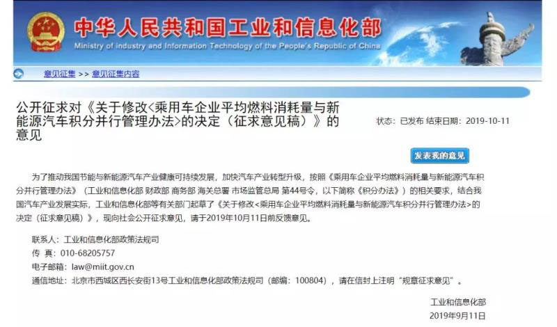 9月11日,工信部等有關(guān)部門(mén)公布了《關(guān)于修改<乘用車(chē)企業(yè)平均燃料消耗量與新能源汽車(chē)積分并行管理辦法>的決定(征求意見(jiàn)稿)》(以下簡(jiǎn)稱(chēng)新版雙積分政策修正案),這一次依舊向社會(huì)公開(kāi)征求意見(jiàn),并提出請(qǐng)于2019年10月11日前反饋意見(jiàn)。