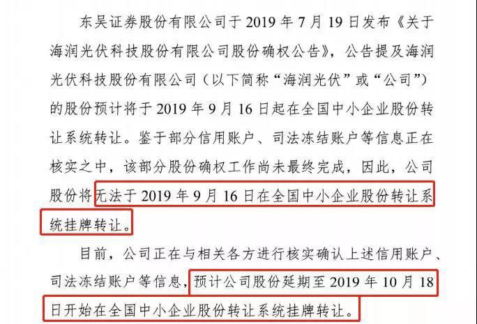 沉寂許久的海潤再次引起了行業(yè)的關(guān)注。9月12日,海潤光伏在全國中小企業(yè)股份轉(zhuǎn)讓系統(tǒng)(簡稱“新三板”)兩網(wǎng)及退市企業(yè)板塊發(fā)布了一則臨時(shí)公告,公告稱:鑒于部分信用賬戶、司法凍結(jié)賬戶等信息正在核實(shí)之中,該部分股份確權(quán)工作尚未最終完成,海潤光伏無法于2019年9月16日在新三板掛牌轉(zhuǎn)讓。