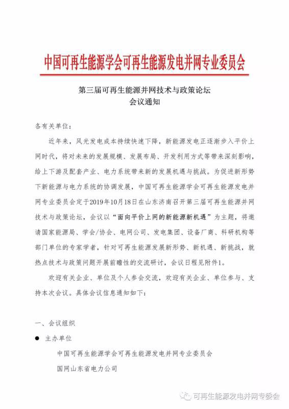 中國儲(chǔ)能網(wǎng)訊:中國可再生能源學(xué)會(huì)可再生能源發(fā)電并網(wǎng)專業(yè)委員會(huì)定于2019年10月18日在山東濟(jì)南召開第三屆可再生能源并網(wǎng)技術(shù)與政策論壇,會(huì)議主題為“面向平價(jià)上網(wǎng)的新能源新機(jī)遇”為主題,會(huì)議通知如下。