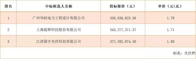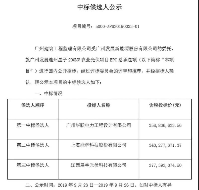 同日,廣州發(fā)展連州星子200MW農(nóng)業(yè)光伏項(xiàng)目公示了EPC總承包中標(biāo)候選人。廣州華躍電力工程設(shè)計(jì)有限公司以單價(jià)1.79元/瓦位列第一中標(biāo)候選人,詳情如下: