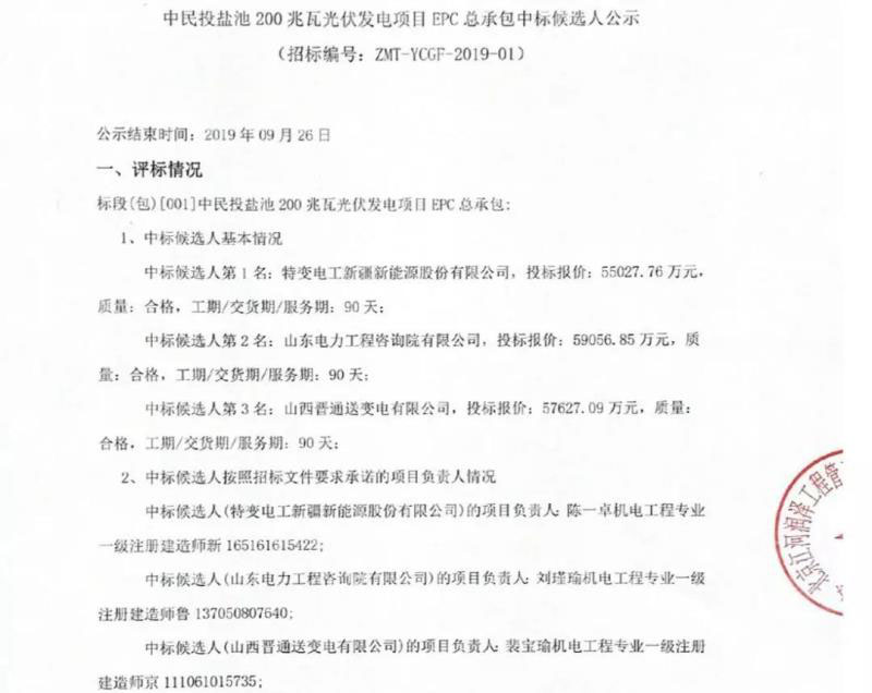 中國(guó)儲(chǔ)能網(wǎng)訊:9月23日,中民投鹽池200MW光伏發(fā)電項(xiàng)目公示了EPC總承包中標(biāo)候選人。特變電工新疆新能源股份有限公司以單價(jià)2.75元/瓦位列第一中標(biāo)候選人,詳情如下: