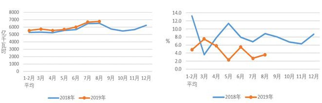 圖1 2018、2019年分月全社會用電量及其增速