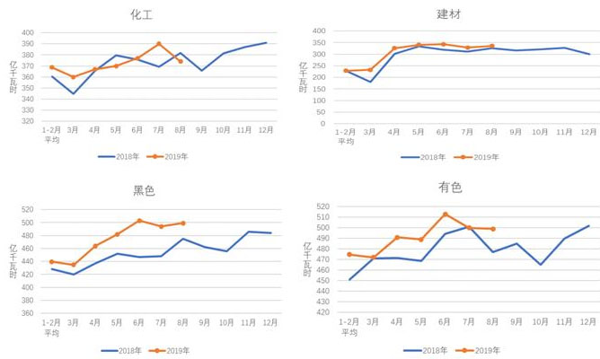 8月份,四大高載能行業(yè)用電量合計1708億千瓦時,同比增長2.0%,增速比上年同期回落5.4個百分點,占全社會用電量的比重為25.2%。其中,化工行業(yè)用電量374億千瓦時,同比下降2.0%,增速比上年同期回落5.2個百分點;建材行業(yè)用電量336億千瓦時,同比增長3.1%,增速比上年同期回落3.0個百分點;黑色金屬冶煉行業(yè)用電量499億千瓦時,同比增長4.9%,增速比上年同期回落9.1個百分點;有色金屬冶煉行業(yè)499億千瓦時,同比增長1.5%,增速比上年同期回落4.2個百分點。