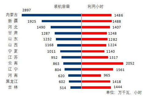 圖5 1-8月份風電裝機較多省份風電裝機容量和設備利用小時
