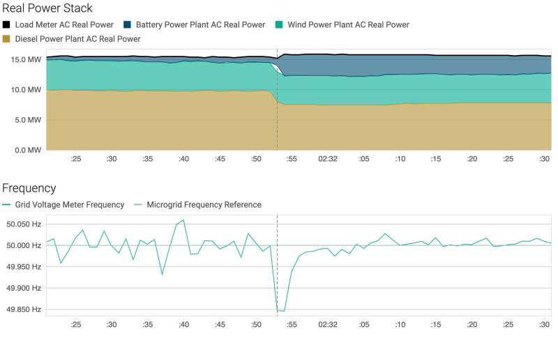 例如,在一個(gè)風(fēng)力發(fā)電設(shè)施和儲(chǔ)能系統(tǒng)配套運(yùn)行的示例中,五個(gè)正在運(yùn)行的風(fēng)力發(fā)電機(jī)的一個(gè)突然出現(xiàn)故障,并斷開了與電網(wǎng)的連接。這導(dǎo)致電網(wǎng)頻率急劇下降和電壓下降,其原因是其他正在運(yùn)行的發(fā)動(dòng)機(jī)和電池的負(fù)載應(yīng)變突然增加。由于逆變器的快速響應(yīng),儲(chǔ)能系統(tǒng)在這個(gè)風(fēng)力發(fā)電機(jī)停機(jī)后立即增加了2.4MW的功率輸出,以彌補(bǔ)損失的發(fā)電量。來自電池儲(chǔ)能系統(tǒng)的快速功率注入還使電網(wǎng)快速穩(wěn)定和恢復(fù)頻率和電壓。因此,儲(chǔ)能系統(tǒng)在穩(wěn)定電網(wǎng)運(yùn)營中起到了至關(guān)重要的作用。