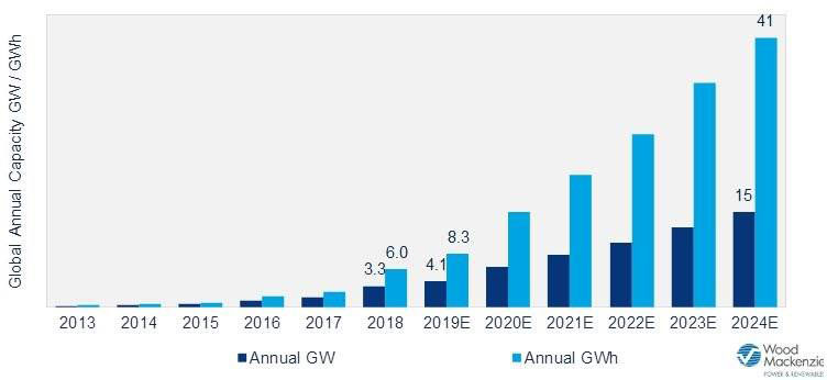 根據(jù)調(diào)研機(jī)構(gòu)Wood Mackenzie Power & Renewables公司的調(diào)查數(shù)據(jù),2018年,全球儲(chǔ)能部署容量同比增長147%,裝機(jī)容量達(dá)到3.3GW,儲(chǔ)能容量達(dá)到6GWh。其增長幾乎是該行業(yè)2013年至2018年74%復(fù)合年平均增長率的兩倍。Wood Mackenzie儲(chǔ)能研究負(fù)責(zé)人Ravi Manghani在今年4月發(fā)表調(diào)查結(jié)果時(shí)表示,去年的部署儲(chǔ)能容量量占到過去五年部署儲(chǔ)能總?cè)萘康囊话胍陨?,這表明全球儲(chǔ)能部署需求呈上升趨勢。