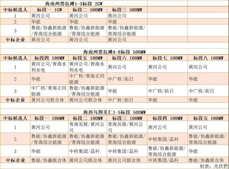 按照一般的中標(biāo)原則,黃河公司/黃河公司聯(lián)合體將優(yōu)選單體規(guī)模最大的標(biāo)段,即將海南州塔拉灘1-3標(biāo)段收入囊中,其他標(biāo)段將順延給第二中標(biāo)候選人。那么最終中標(biāo)結(jié)果中,國家電投/國家電投聯(lián)合體收獲2.4GW光伏+1.65GW風(fēng)電,華能、魯能、中廣核、中核、三峽、華電等也在青?;刂杏兴鶖孬@。