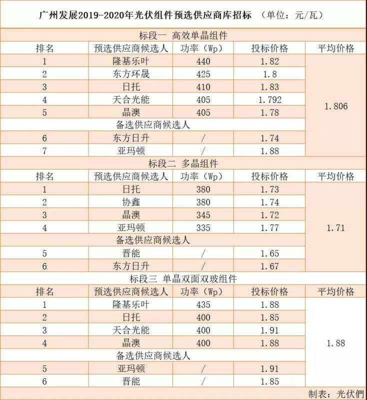中國儲能網(wǎng)訊:10月8日,廣州發(fā)展新能源公布2019-2020年光伏組件預(yù)選供應(yīng)商庫招標(biāo)結(jié)果,隆基樂葉、東方環(huán)晟、晶澳、天合光能、協(xié)鑫以及日托入圍。據(jù)了解,此次招標(biāo)規(guī)模為1.06GW,根據(jù)規(guī)則,廣州發(fā)展新能源將根據(jù)中標(biāo)候選人具體項目的比價結(jié)果進行訂單采購。