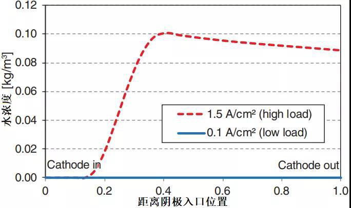相反,當空氣側(cè)注入海鹽氣溶膠形式的NaCl,并沒有發(fā)現(xiàn)阻值上升。為此,本田汽車公司對Clarity燃料電池陰極流場冷凝水情況進行了模擬。結果表明,在該研究的測試工況下陰極流道沒有產(chǎn)生冷凝水,歐姆阻值沒有上升是因為海鹽氣溶膠NaCl沒有溶解成冷凝水和離子,鈉離子并沒有進入質(zhì)子膜。同時研究指出,應當考慮高負荷(大電流密度)條件下海鹽氣溶膠NaCl進入質(zhì)子膜的情況(陰極流道有冷凝水)。