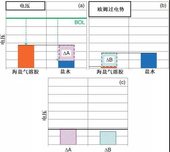由上圖可知,海鹽氣溶膠形式的NaCl對電池性能衰減的影響弱于NaCl水溶液。通過分析歐姆過電勢發(fā)現(xiàn),相比海鹽氣溶膠,當空氣中注入NaCl水溶液,歐姆過電勢較大。圖中陰影部分的電壓降△A值剛好接近陰影部分的歐姆過電勢壓降△B值。因此,可以認為電壓降正是由歐姆過電勢引起的。相關研究里提到,當質(zhì)子交換膜中聚合物鏈傳遞鈉離子時(非氫離子),質(zhì)子膜的阻抗將大幅增加。因為,當空氣中含有NaCl水溶液時,鈉離子會取代氫離子,在膜中傳遞,引起歐姆過電勢增加。