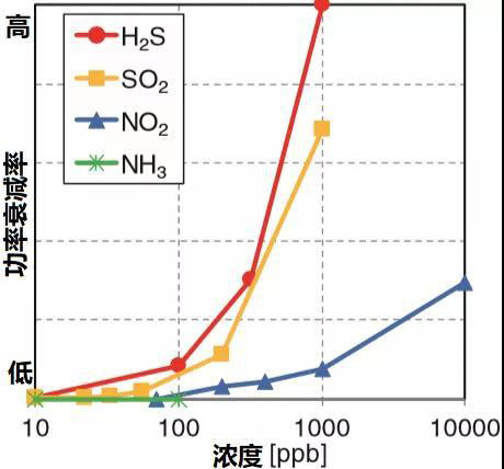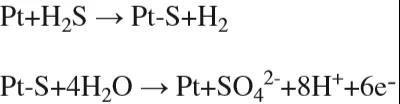 上圖為氣體雜質(zhì)濃度和功率衰減率之間的關系。可以發(fā)現(xiàn),四種雜質(zhì)氣體和濃度呈現(xiàn)正相關(指數(shù)變化),且兩種含硫雜質(zhì)(H2S、SO2)表現(xiàn)出相似的行為。原因是對于兩種含硫雜質(zhì)(H2S、SO2),吸附在催化劑Pt表面活性點的硫最終以硫酸根離子形式存在,參考以下化學反應式。